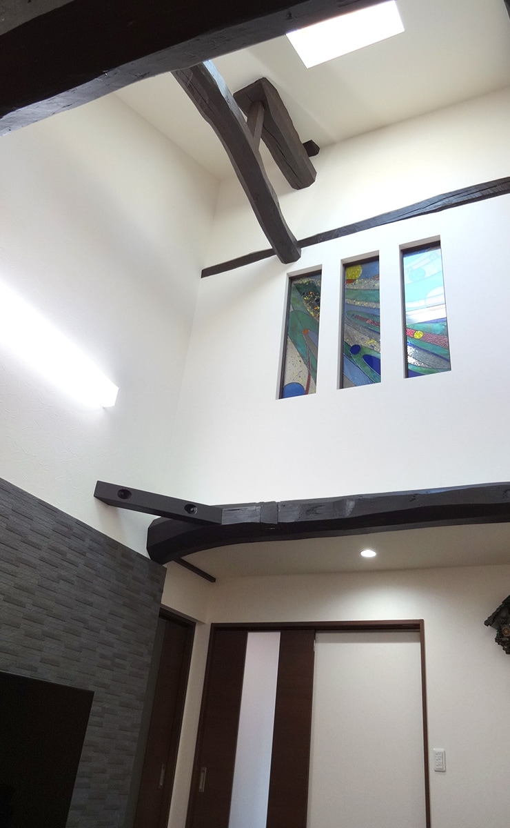 ここでも奥様のつくったステンドグラスや梁の塗装で、空間に彩りをプラスしています。