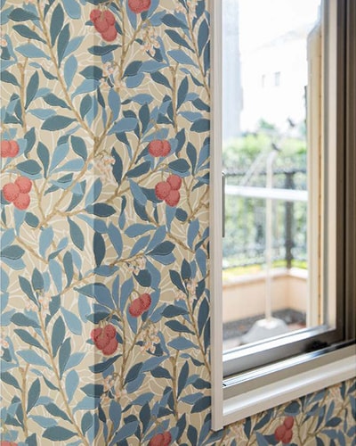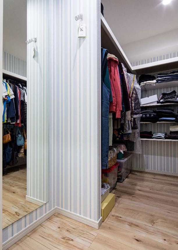 和室の残りのスペースはアクセントクロスが施された衣裳部屋に。大きな姿見の横にはハンガーフックを設置。毎日の洋服選びが楽しくなります。