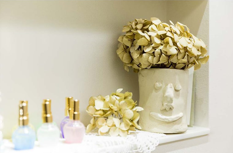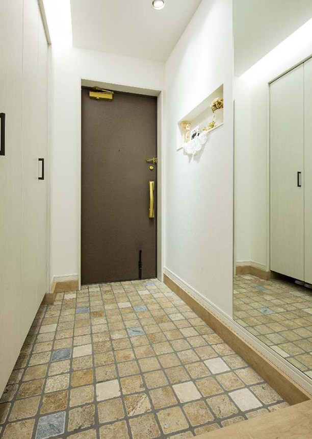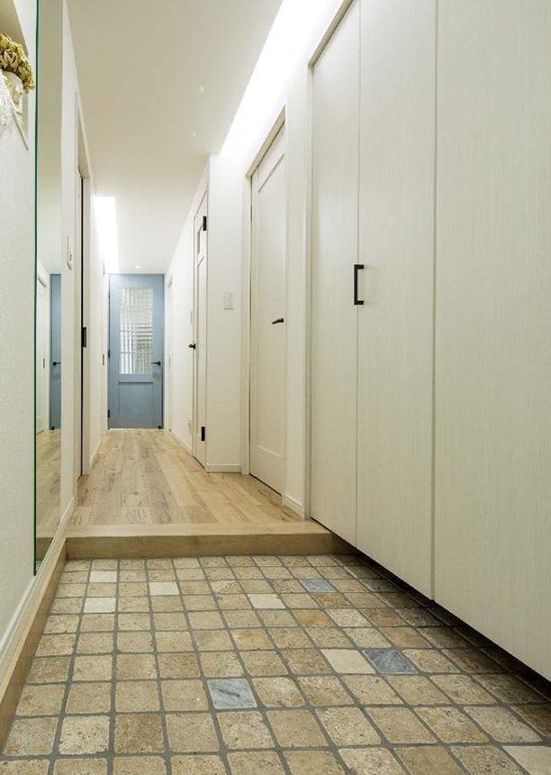 玄関を開けると目に入るブルーグレーのリビングドア。エントランスのタイルはテラコッタタイルをベースとしながらも、ドアと同系色のタイルを少しだけ混ぜることで一気に空間が統一されています。姿見とニッチスペースで機能性も確保。