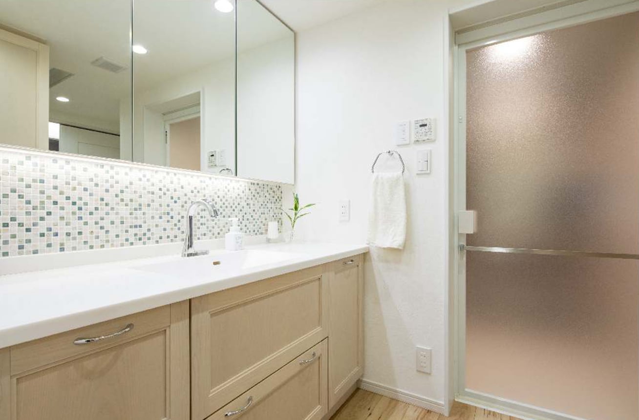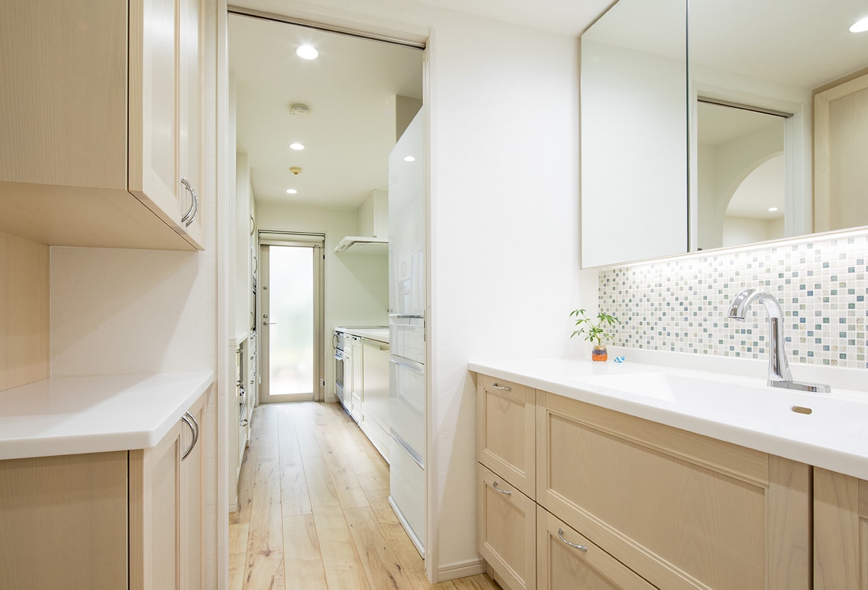 キッチンと洗面室が繋がる使い勝手の良さはそのままに、設備を一新。キャビネットはオリジナルで制作し、デザインにこだわりました。洗面化粧室にはリネン収納も追加し、三面鏡の下にはモザイクタイルを施しています。