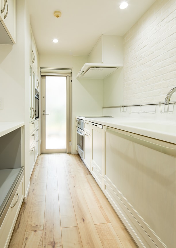 キッチンももちろんホワイト。大きな食器棚とカウンター収納を造作し、調理家電も全て収まる美しい空間になりました。