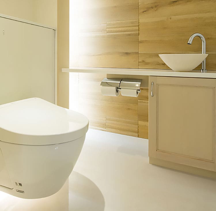 木目のアクセントウォールと間接照明で落ち着いた印象に。洗面台と同じ建具で仕上げた手洗いカウンター、お掃除もしやすくすっきりとした浮いているトイレなど、細部までこだわっています。
