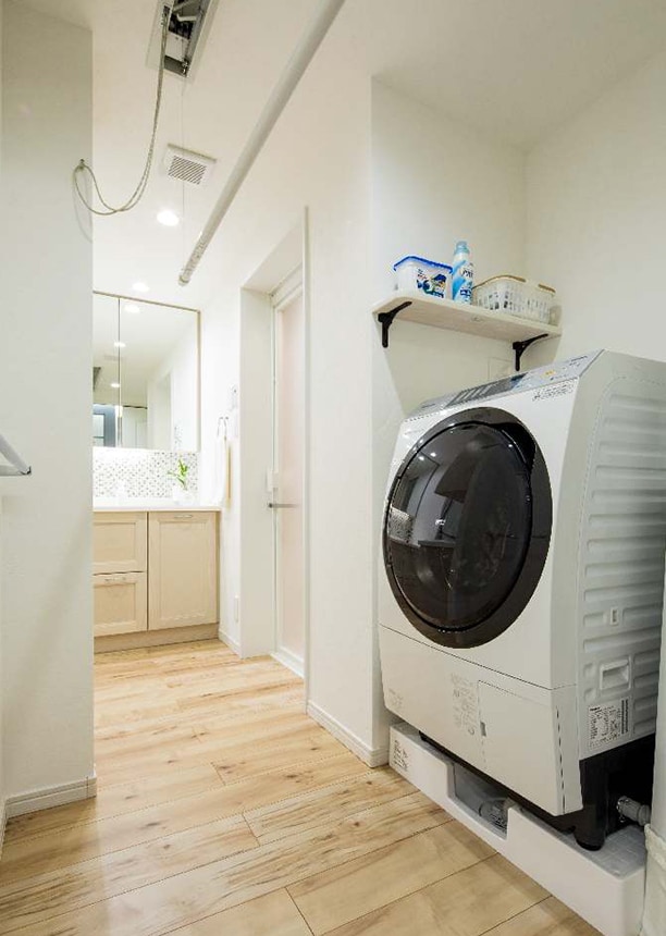 洗面化粧室の洗濯機前には収納式の室内干しを設置。雨の日のお洗濯も安心です。