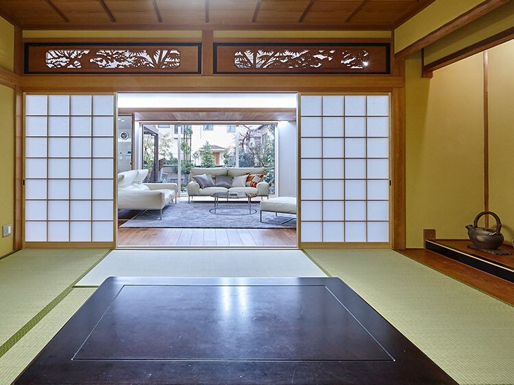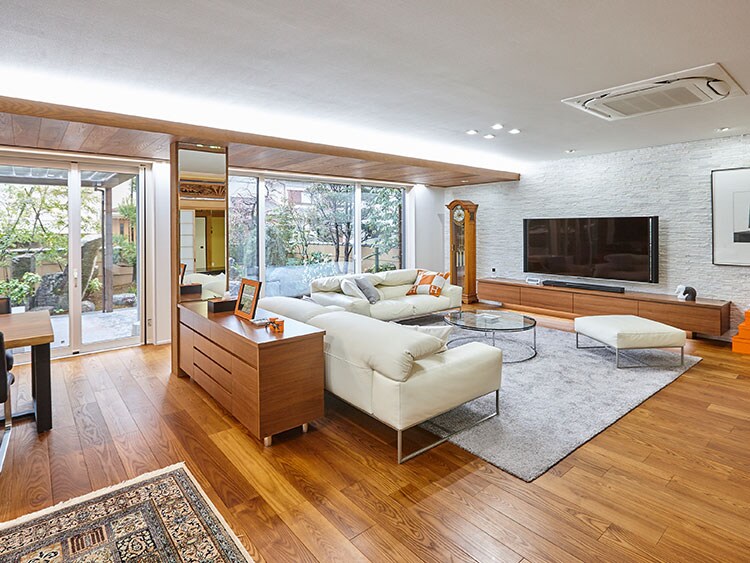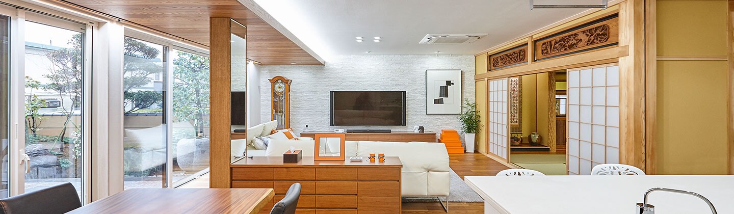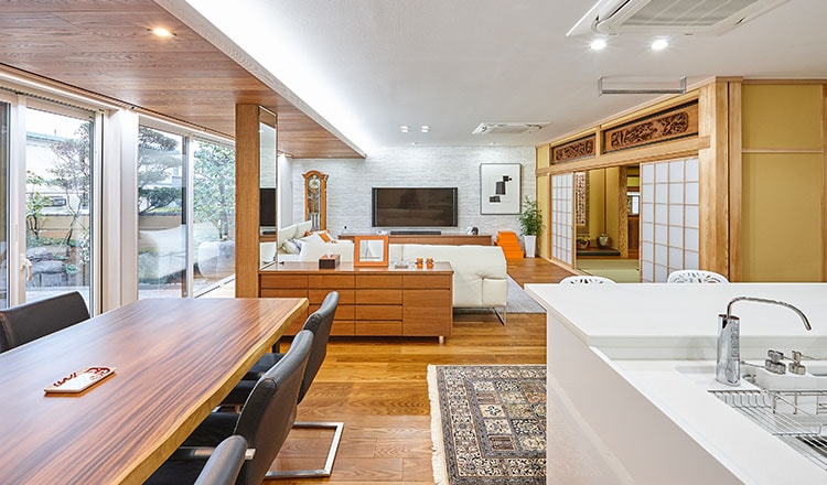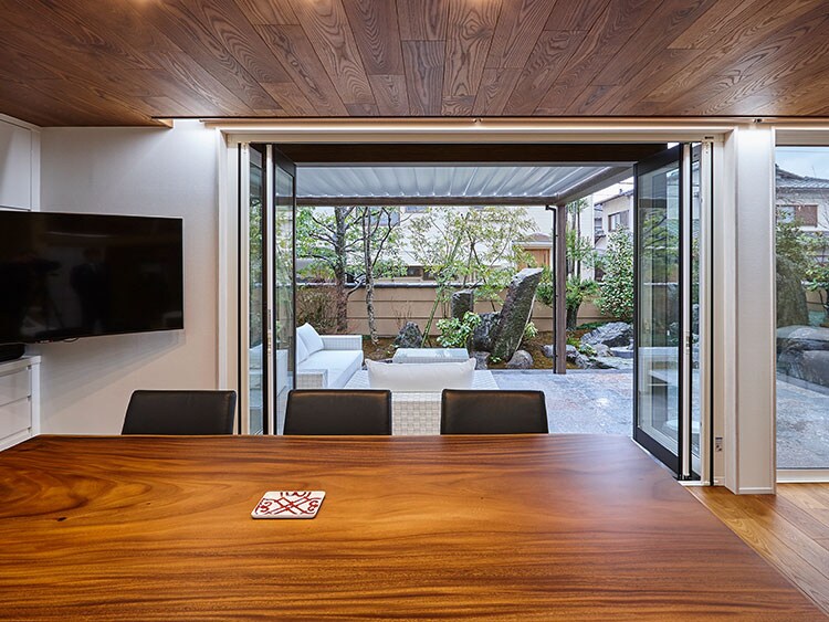 受け継がれてきた由緒ある純和風の空間を残しつつ、広々とした開放的なくつろぎの空間をつくりました。テラス部分でもくつろげるよう、ダイニングにワイドオープンサッシを採用しました。