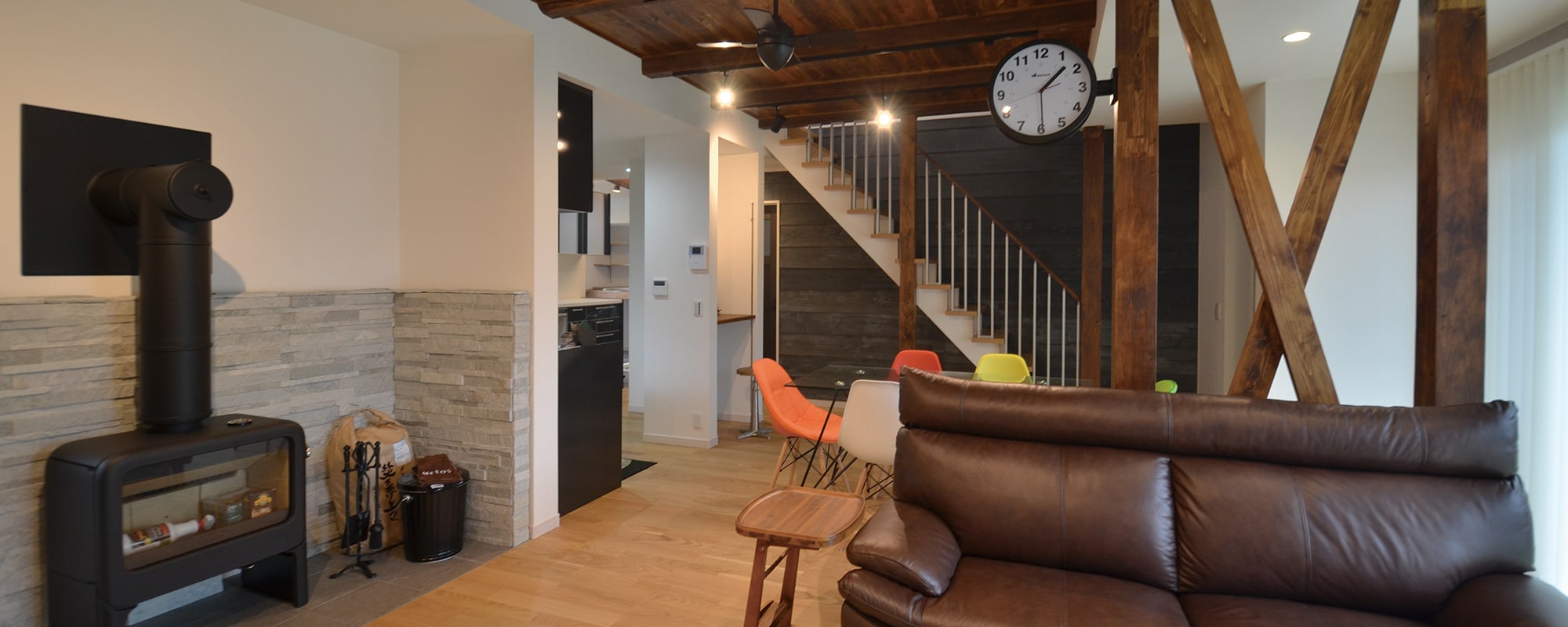 台所、二間続きの和室、縁側など、部屋ごとに区切られた昔ながらの戸建ての間取りでした。6人家族が心地よく過ごせる空間にするため、必要な耐力壁のみを残して間仕切壁を撤去、階段もスケルトンを採用し、広々としたLDKとなりました。区切りをなくすことで、遮断されていた採光も確保できました。既存の柱や梁とカラフルなインテリアとを組み合わせることで遊び心のある仕上がりとなりました。